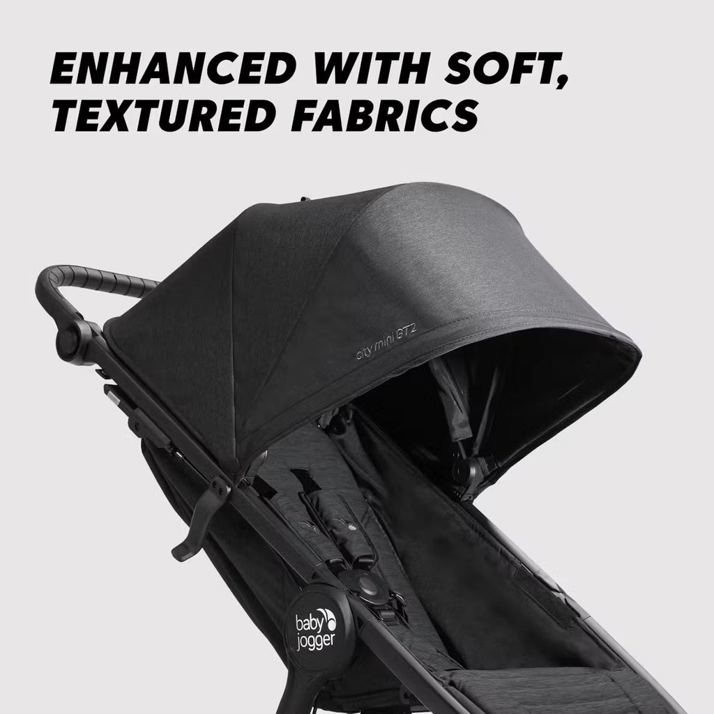 The Baby Jogger® city mini® GT2 Stroller, Eco Collection, provides uncompromising agility on any terrain thanks to forever-air rubber tires that will never go flat and all-wheel suspension. It is enhanced by an included leatherette belly bar and made with recycled fabrics that have a soft, textured feel your baby will love. The signature one-hand compact fold, adjustable leatherette handlebar, and hand-operated parking brake provide you with the ultimate convenience, while the adjustable calf support and near-flat seat recline allow you to find the most comfortable position for your child. The Harness Asisst technology allows you to adjust the fit of the harness without having to rethread—a major win for on-the-go parents. Create a travel system using the included Baby Jogger® infant car seat adapters or customize your ride with the following accessories (sold separately): parent console, glider board, child tray, weather shield, bug canopy, foot muff, and carry bag.