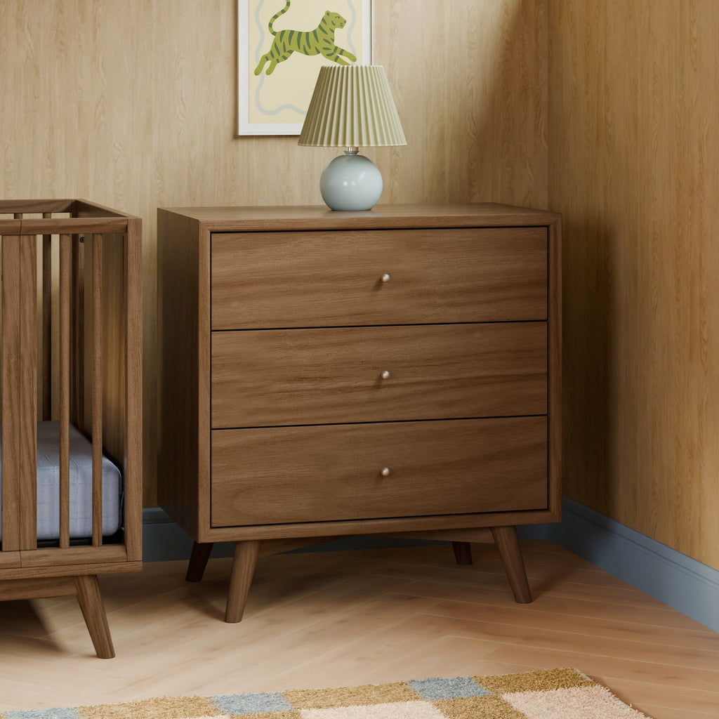 The Palma 3-Drawer Dresser is a sophisticated mid-century inspired design with tapered legs, brushed metal hardware, and smooth-glide drawers. It's a versatile modern piece, providing ample storage space that can double as a changing station. Pair with the Palma 4-in-1 Crib or Peggy 3-in-1 Crib for an elegant nursery.