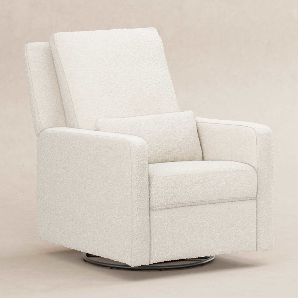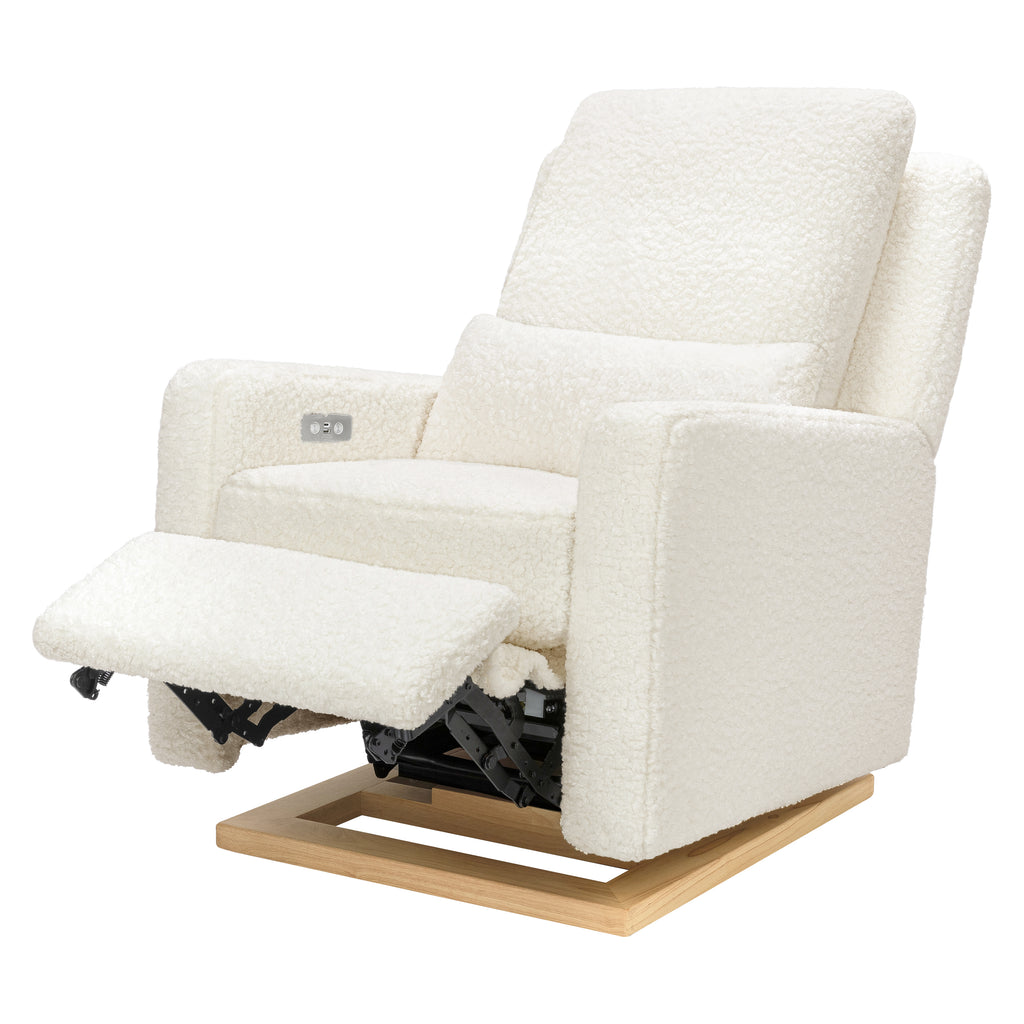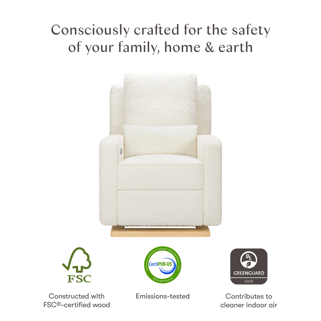 The Sigi Glider Recliner is a stylish choice with its crisp, modern design and comfortable seat on a light wood base. Effortlessly glide back and forth in an upright position to rock your baby to sleep, or lean back and relax at the touch of a button with this recliner's quiet electronic control button. Upholstered by hand in our eco-performance fabric that is stain resistant, water repellent, and made with at least 30% recycled fiber, it is a more sustainable choice for your baby and home.