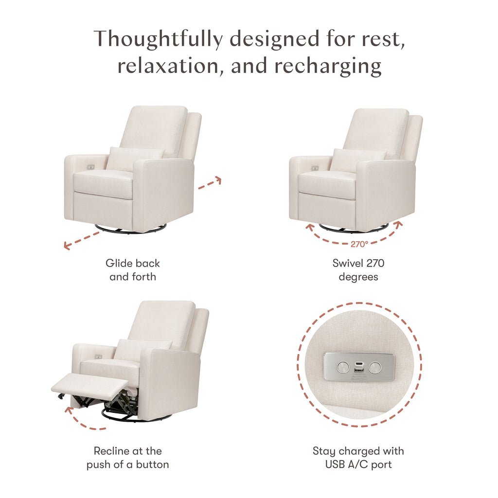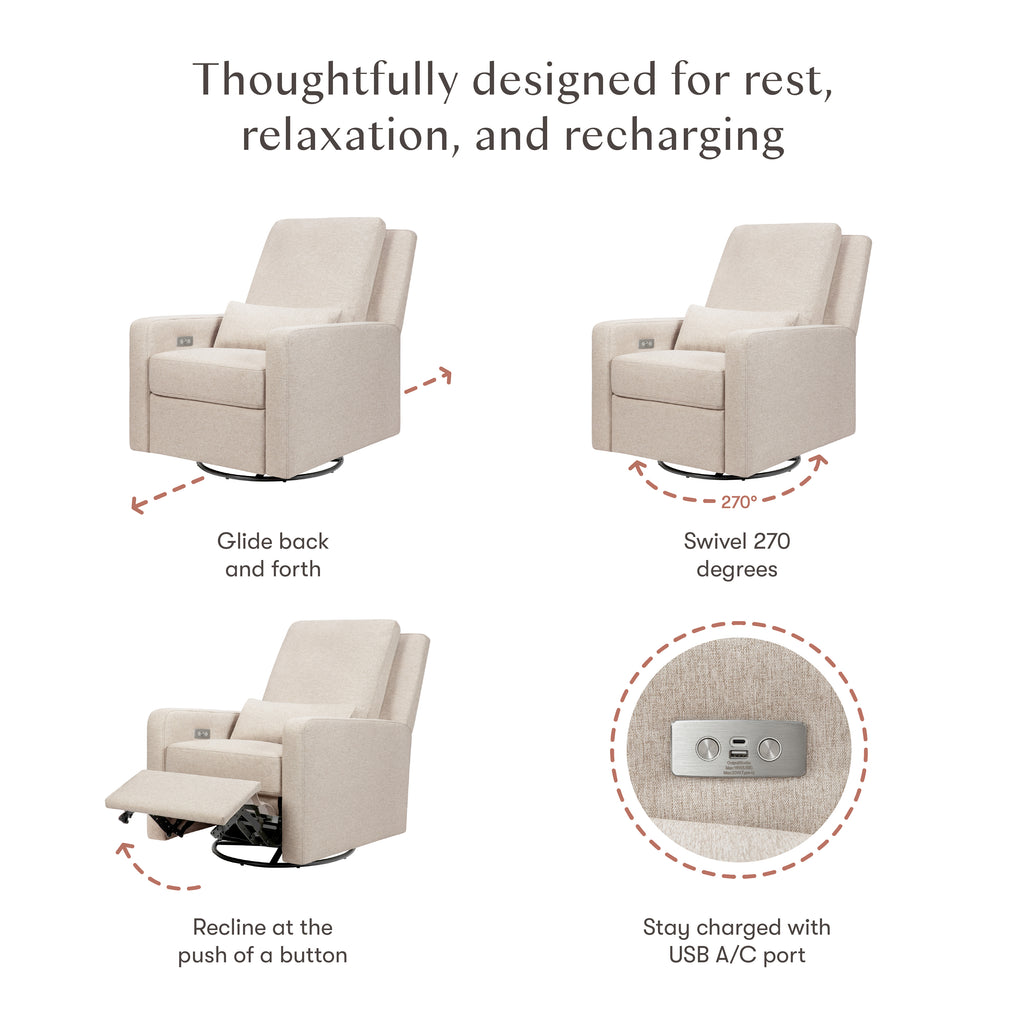 - POWER RECLINER & GLIDER: Smooth and quiet reclining mechanism lowers headrest and raises footrest effortlessly with the push-button control panel and an included USB charging port keeps your phone fully charged. It also glides back and forth in an upright position. PLEASE NOTE: Charging panel is only rated for small devices such as a phone, DO NOT use for large devices such as a tablet. Doing so will damage the motor and eliminate power (charging and reclining) capabilities.