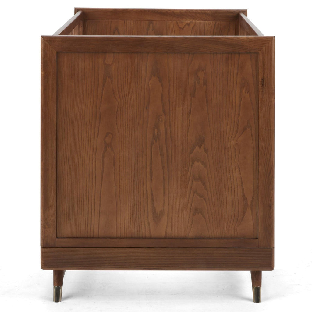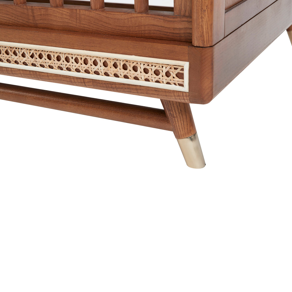 The Kindred Everheart 4-in-1 Convertible Crib celebrates the appeal of mid-century modern styling featuring clean, straight lines, elegantly sculpted legs, and natural rattan detailing along the base. The timeless design is highlighted with special details like round spindles and brass-finished steel accents. Crafted with walnut-stained solid ash wood to complement the décor of any nursery.