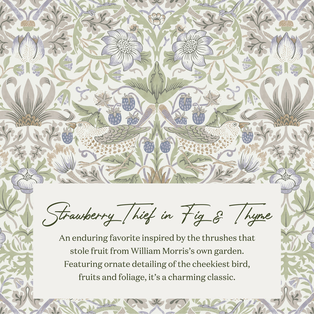 - ABOUT THE DESIGN: An enduring favorite at Morris & Co., this enchanting design was inspired by the thrushes that stole fruit from William Morris's own garden. Featuring ornate detailing of the cheekiest bird, fruits and foliage, it's a charming classic.
